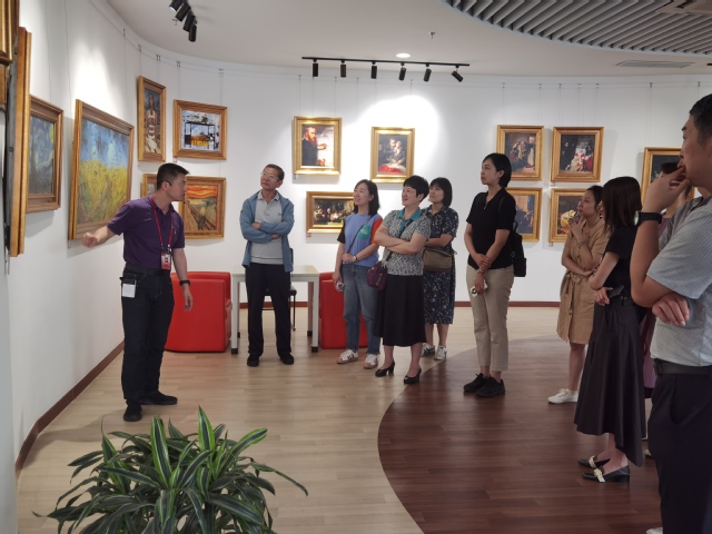 彭骏首先就我校图书馆建设情况向来访者做了简要介绍,重点介绍了图书馆在医学人文教育方面的探索和创新做法。近年来,图书馆积极践行“人文+实践”医学生培养理念,充分发挥自身资源优势,以凸显医学人文精神的各类文化活动为载体,积极参与“馆”“展”“剧”健康新叙事实践,有效进行医学人文教育与传播。之后,在彭骏带领下,来访者先后参观了位于南苑图书馆的医学名画空间和红色医学教育主题展。