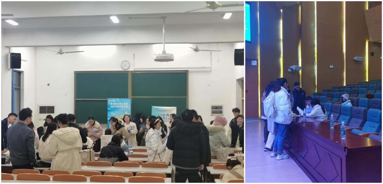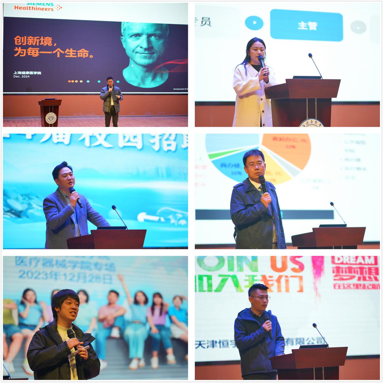 会议第二部分是企业宣讲。让毕业生高质量就业始终是学院的工作目标,为让学生企业面对面,学院主动对接联系了西门子医疗、海尔施集团、恒宇医疗、上药医疗器械、华润医药、汇成物业等公司招聘负责人,来校集中为毕业生宣讲。各参会企业招聘负责人从上海、天津、宁波、杭州等地带着岗位赶来招聘,他们依次上台宣讲,从企业规模、发展历程、员工晋升规则、薪酬福利、多彩多样的企业活动等同学们较为关心的问题为同学们进行讲解,并用已毕业学长学姐入职后的丰富案例和良好的互动带动宣讲会的氛围。
