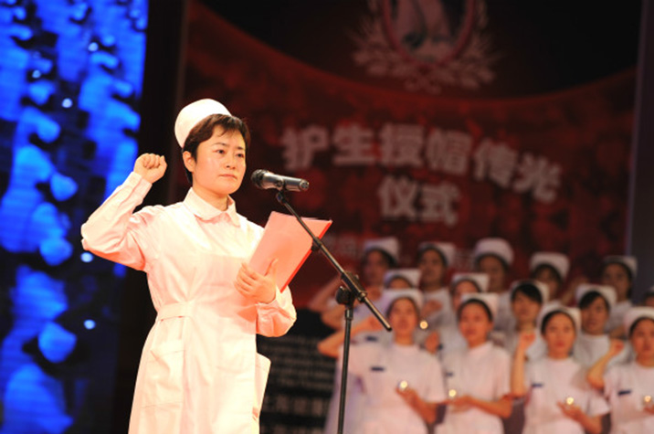 在《平安夜》庄严而优美的乐曲中,授帽仪式正式开始,上海市护理质控中心主任施雁老师点燃象征生命之光的红烛。一群手捧烛火的白衣天使缓缓走上舞台,中山医院护理部主任徐建鸣、华山医院护理部主任蒋红、上海市第五人民医院副院长杨青敏、OD网页版徐汇校区教授余剑珍、OD网页版浦东校区现代护理职教中心主任戴鸿英、肿瘤医院护理部主任陆箴琦、儿童医院护理部主任龚梅、普陀人民医院护理部主任于井子、大华医院宣飞燕工作室副主任宣飞燕和护理系20名教师为即将走上实习岗位的护生们进行授帽。685名学生穿上最美的衣装,戴上圣洁的燕帽,洁白的燕帽下闪烁着同学们坚定的目光,无暇的护士服中拥裹着白衣天使们高尚的情怀。随后男护生代表手捧鲜花上台,向这些兢兢业业、勤勤恳恳、甘于平凡的天使榜样们献礼,表达心中对前辈们的无限崇敬。之后由行业劳模于井子老师带领护士诵读南丁格尔誓言,一句句掷地有声的誓言在摇曳的烛光中荡漾,庄严的氛围净化和感动着在场每个人的心灵,让大家深深感受到了白衣天使这个职业的崇高和光荣。