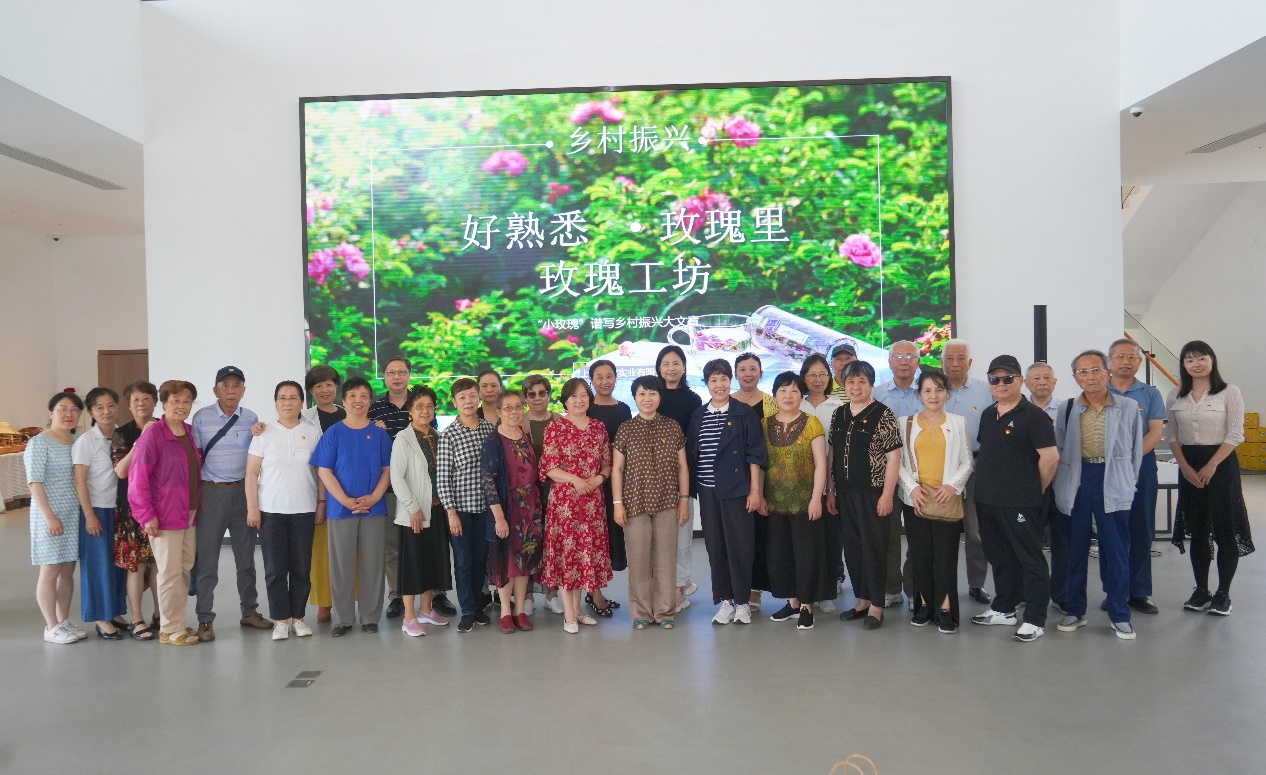 老同志们兴致勃勃地参观了玫瑰工坊、“连字稻田”、符氏老宅和玫瑰书屋。“玫瑰工坊”深居浦东新区川沙新镇连民村,这里保留了原住居民的农田,周边是一系列配套经济带。“乡村建设”的旗帜刚插到浦东,上海闽龙实业有限公司就将南疆的特色沙漠玫瑰植入田头,发展玫瑰产业,形成集种植、生产、加工、销售于一体的完整产业体系。闽龙实业“始终坚持品质第一”的企业发展理念,十余年来,闽龙实业扎根西部地区,从脱贫攻坚到乡村振兴,以产业援疆带动当地就业,在不断拓宽品牌产品的同时,更注重企业的人文素养关怀,践行了社会责任,彰显了巾帼不让须眉的家国情怀、豪情壮志与巾帼力量。