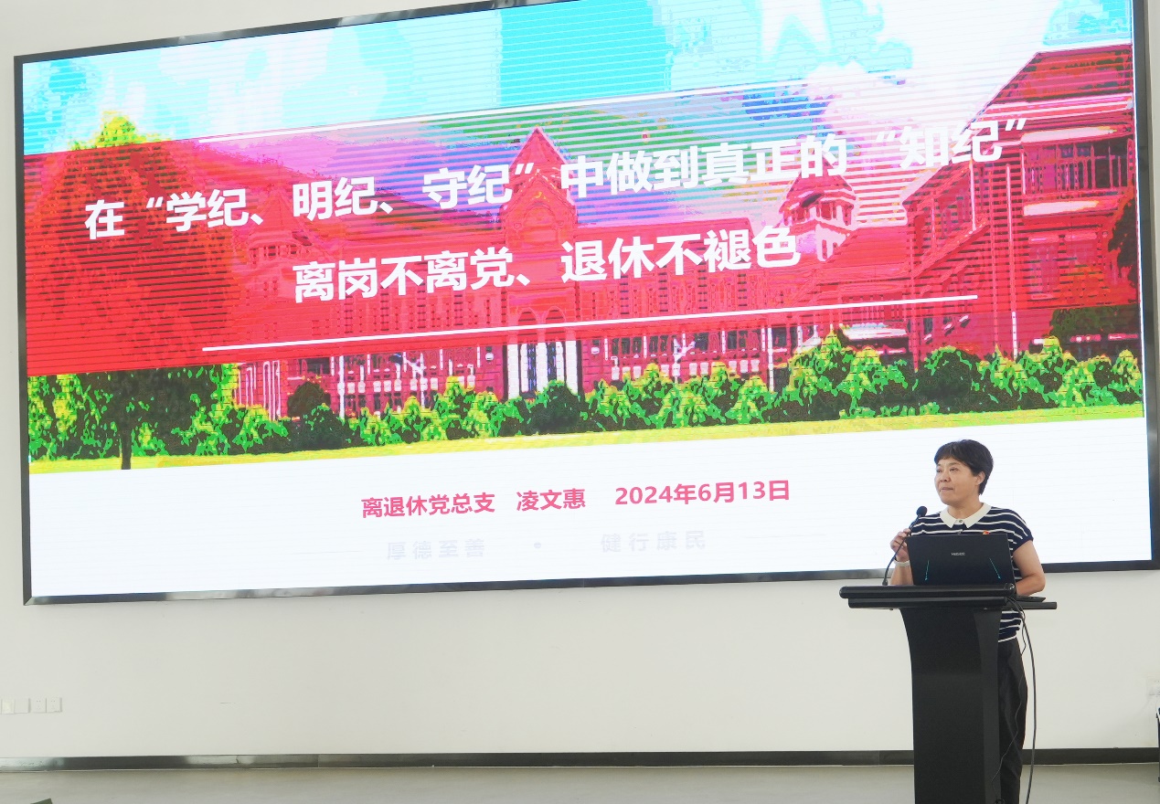 6月13日下午,离退休党总支书记凌文惠为离退休党支部书记、委员、特邀党建组织员等老师带来了一场主题为“在学纪、明纪、守纪中做到真正的知纪,离岗不离党,退休不褪色”的党课。她从中共中央办公厅下发《通知》的要求、市教卫工作党委就党纪学习教育的工作部署、原原本本逐章逐条学习和《条例》新增和修订的解读四个方面进行了讲授和领学,同时强调了离退休党员在立德树人、服务群众中的重要作用,切实把党纪学习教育进一步引向深入。