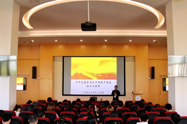 第二场专题学习由马克思主义学院江先锋老师主讲,课程题为“百年巨变与中国共产党的初心和使命”。江老师以中国近现代史为切入点,叙述了中国从晚清时期任列强欺凌、民族精神渐颓、国家衰败不堪,到如今进入新时代中国特色社会主义的繁荣富强,这一切都是在中国共产党带领之下完成的,饱经磨难的中华民族从站起来,到富起来,到强起来,必将实现中华民族伟大复兴。(医学影像学院)