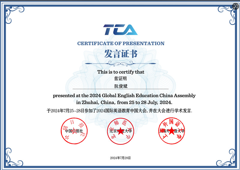 近日,外语教学部教师团队代表阮俊斌老师参加国际英语教育中国大会,并以《信息贡献度支持下的医学外语教育知识体系研究(Research on the Support of Information Contribution to the Knowledge System of Foreign Language Education of Medical Schools)》为题,作学科融合专题发言。