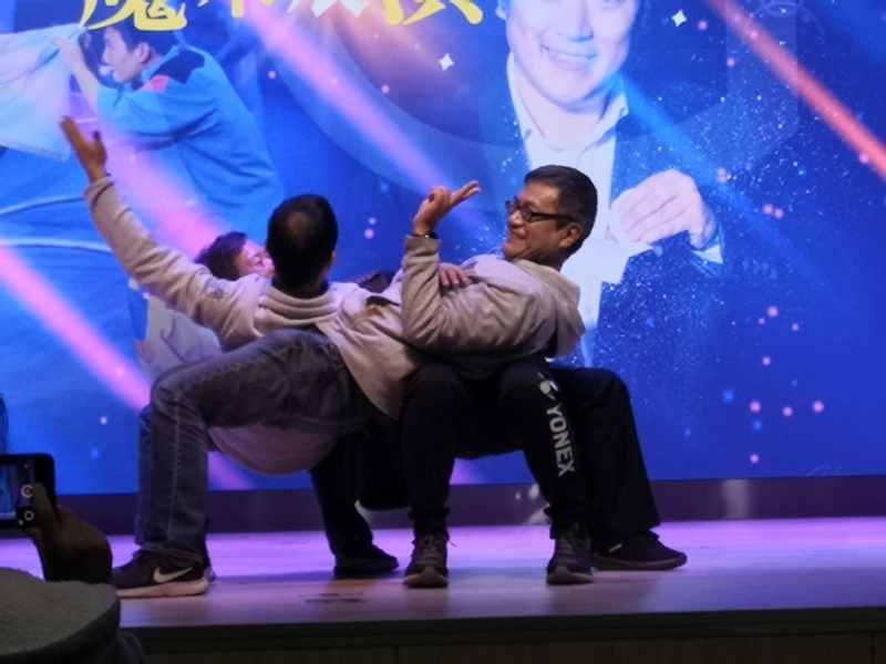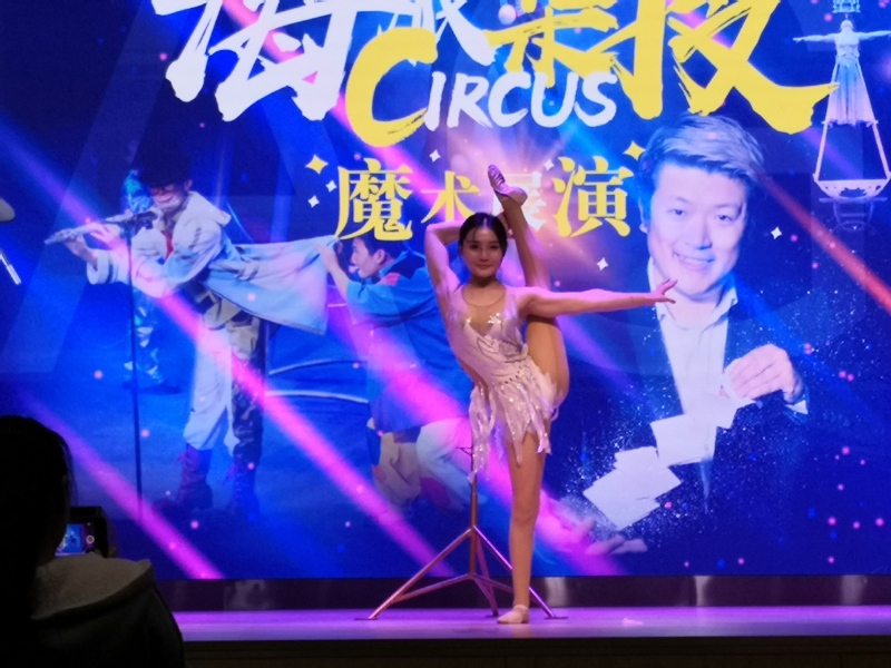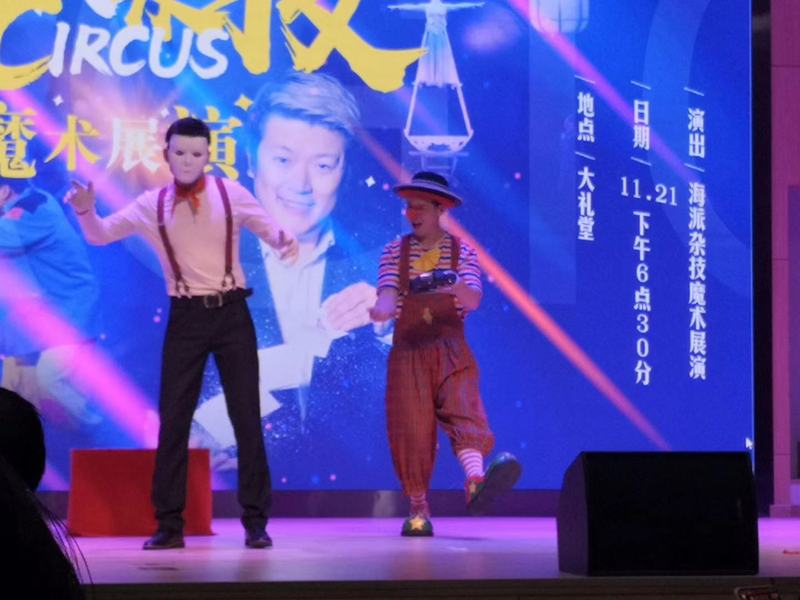 伴随着欢快的音乐,魔术师周舫表演的《开场魔术》用神奇的表演与有趣的互动,使观众陶醉于魔术的奇妙世界里。《单人顶》演员用单手倒立等诸多难度极高的技巧组合;《滑稽飞镖》中两名演员扮演小丑进行飞镖扎气球展示;《呼啦圈》的女演员用自己的肢体,支撑起多个呼啦圈,不时变动着呼啦圈的角度和节奏,时而直立平缓,时而伏地翻旋,让观众感受到了别样的舞台魅力;《球技》目不暇接的视觉效果赢得了台下师生的阵阵掌声;在轻柔舒缓的音乐声中,荣获蒙特卡洛马戏节比赛最高奖项——“金小丑”奖的《单人艺术造型》演出,抓住了每一位观众的眼球;在同学们热烈的掌声中,魔术师邀请了四位老师上台一起表演,四人围成一圈坐下,一个接一个躺在对方的腿上,神奇的是抽掉椅子后四人竟没有倒下,让整场表演达到了高潮。该节目摆脱单纯技巧展示,运用极富表现力、感染力的表演,使台下的观众在力与美的艺术氛围中得到愉悦的享受。