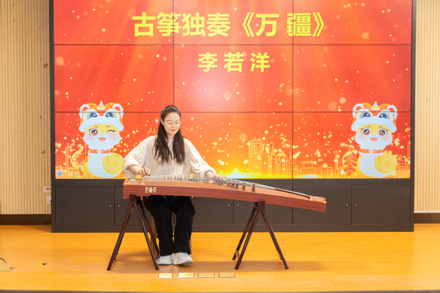 以琴韵画意,以欢声迎新。李若洋带来古筝独奏《万疆》,以其娴熟的指法、细腻的情感,弹奏出激昂奋进的旋律,展现出祖国山河的壮美与人民的豪迈,寓意着在新的一年,我校师生携手共进、开创更加辉煌的未来。