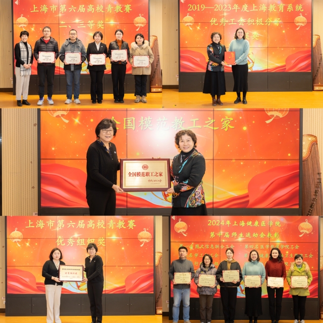 表彰环节,于莹、凌文惠、郁建新为获奖人员颁奖:中华全国总工会全国模范教工之家:校工会;2019—2023年度上海教育系统优秀工会积极分子:蒋瑛英;上海市第六届高校青教赛二等奖:沈新娣、董晛、上海市第六届高校青教赛三等奖姜明辉、王莎莎、王梦星、刘赛;上海市第六届高校青教赛优秀组织奖;2024年OD网页版第十届师生运动会教工团体前八名:图文信息联合工会、学工组工会、行政第三组工会、党务组联合工会、医学影像学院工会、健康与公共卫生学院工会、医学技术学院工会、基础医学院工会。
