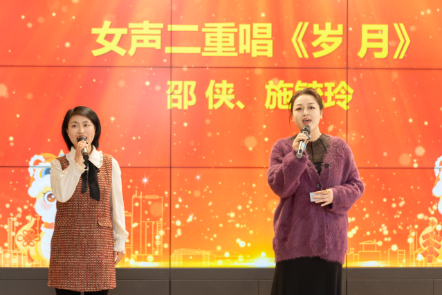 以歌舞传情,以笑语迎春。邵侠、施毓玲带来女声二重唱《岁月》,其悠扬的旋律、深情的歌词,生动表达了对时光流转的感慨与对美好生活的向往。