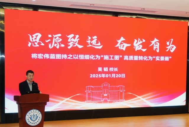 吴韬校长以“思源致远,奋发有为——将宏伟蓝图持之以恒细化为‘施工图’,高质量转化为‘实景画’”为题,对学校“十五五”规划编制工作作了部署。在总结学校“十四五”规划指标任务完成情况基础上,聚焦对标国家及上海高等教育最新政策要求,系统介绍了“十五五”规划的编制背景、编制理念、编制任务和编制保障,并对学校“十五五”规划编制的组织架构、专项规划、时间节点等内容进行了重点部署。