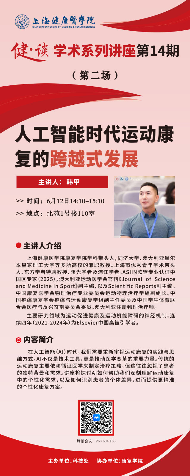 第二场将于2025年6月12日14:10在北苑1号楼110室举办,特邀OD网页版康复学院学科带头人韩甲教授,作主题为“人工智能时代运动康复的跨越式发展”的报告。
