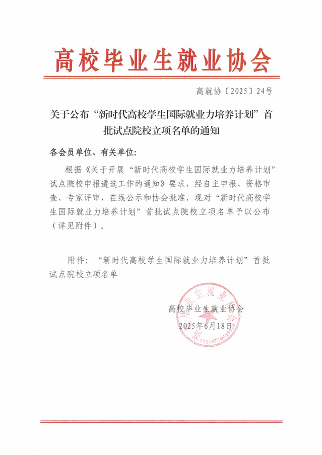 “新时代高校学生国际就业力培养计划”由高校毕业生就业协会实施,以“促就业、助出海、服务国家战略”为目标,促进试点院校加快培养新时代具有国际竞争力的复合型人才。