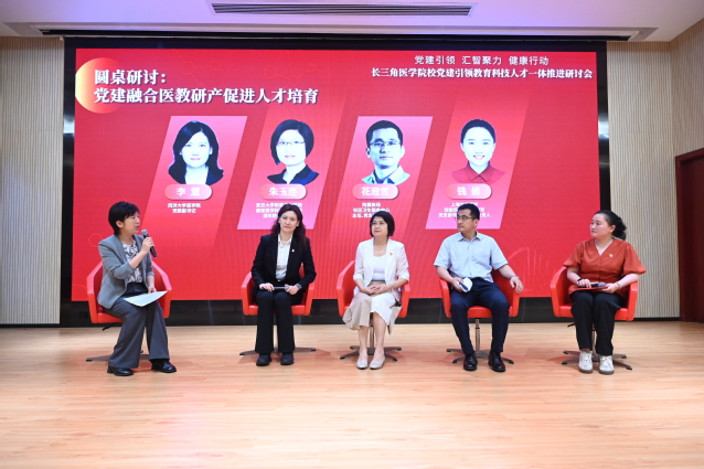 在圆桌研讨环节,同济大学医学院党委副书记李慧,复旦大学附属华山医院康复医学科党支部书记、浦东院区副院长朱玉连,附属新场社区卫生服务中心主任、党支部副书记花迎雪,上海兰卫医学检验所股份有限公司党支部书记钱倩围绕党建融合医教研产促进人才培育,分别从自身工作实践回答了党建聚力如何培育复合型医学人才;如何做好双带头人,把党建深度融入业务中;社区党建如何实现“小站点撬动大健康”;企业党建如何接续培养医学创新人才等问题。