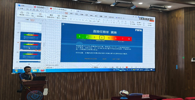上海足协裁判监督程皜宇讲师将争抢犯规的判罚要点融入具体比赛视频中,让学员通过对实际比赛案例的学习和分析了解争抢犯规的识别和判罚。