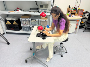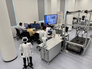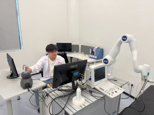 作为学校重要的省部级医工融合创新平台,“上海市智能医疗器械与主动健康协同创新中心、中国长三角——巴尔干半岛生物医药国际技术转移协同创新中心的实验室”里,也正是一派热火朝天的科研景象,师生们以“暑期不打烊”的满格状态,续写着人机共融医疗服务机器人的创新故事。实验团队围绕智慧医疗与主动健康,持续向本领域技术难点发起攻关。在算法调试区,屏幕上跳动的代码映着专注的眼神,师生们紧盯着人体状态感知数据,反复优化算法模型,只为让智能医疗器械更精准地“读懂”患者的生理信号;在机械臂研发区,盛夏的燥热里,大家围在实验台旁,手指抚过机械关节,一遍又一遍调整角度——每一次打磨都藏着“让医疗操作更灵活安全”的执念,汗滴落在金属机械臂上,折射出科研的热度;在模拟导诊台旁,中心同事从语音语调的微调,到应急流程的优化,每一次模拟都指向“更贴合实际场景”的目标,力求让机器人陪护、导诊更有“温度”。