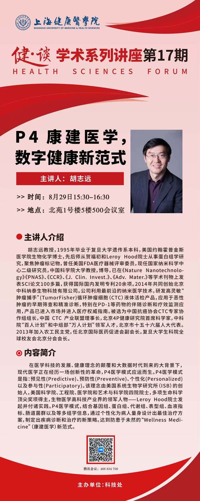 【健·谈】第17期学术系列讲座将于2025年8月29日下午3点半在北苑1号楼500室举办,本期特邀国家纳米科学中心二级研究员,中国科学院大学教授博士生导师胡志远教授来作主题为“P4康健医学,数字健康新范式”的报告。