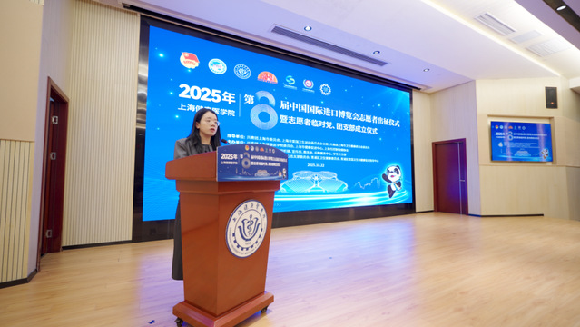 唐红梅为我校第八届进博会志愿者团队授旗,健康“小叶子”们将在服务进博的实践中淬炼成长,在无私奉献的奋斗中磨砺意志,让青春在建设社会主义现代化强国的宏伟征程中,书写新时代的华彩篇章。