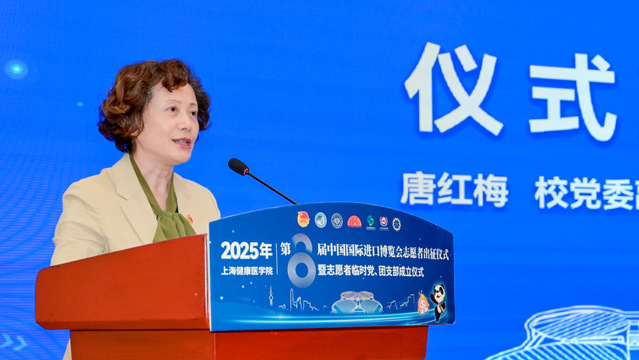 校党委副书记、副校长唐红梅代表学校向到场来宾致以热烈欢迎,并向长期支持学校进博会志愿服务的团市委、卫健委、健康促进中心,以及全体健康“小叶子”们表示衷心地感谢。她指出,健康“小叶子”们已连续多年投身进博舞台,尤其在爱国卫生与健康促进岗位上持续发力,以医学生专业素养在岗位上解答健康问询、普及卫生知识,成为进博会上的靓丽风景。部分“二、三年级”的同学更是续写与进博的缘分,充分彰显服务成效。临近开幕,唐红梅希望同学们牢记“健康所系,性命相托”的初心,以青春之我,展现青春之上海、青春之健康、青春之中国,让世界看到中国青年向上向善的精神风貌。