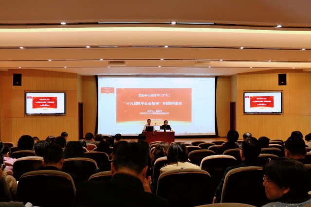 11月20日,我校举行中心组(扩大)学习报告会,邀请了市委党校公共管理教研部副主任陈保中教授作“十九届四中全会精神”专题辅导报告。全体校领导、中层干部、党支部书记、马克思主义学院全体教师、全体辅导员参加了学习。报告会由校党委书记郑沈芳主持。
