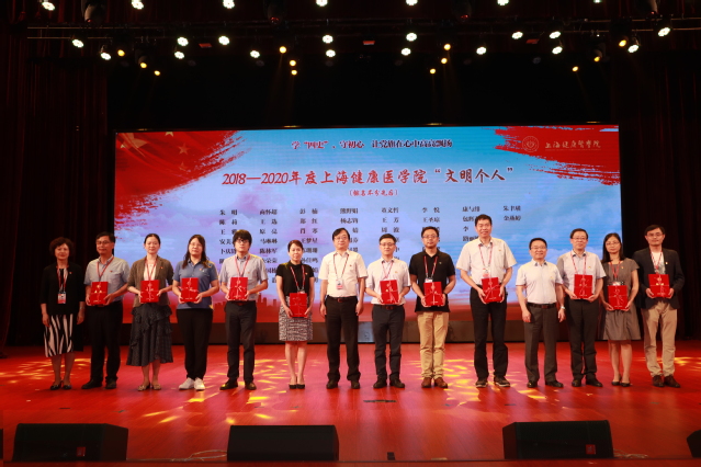 第二篇章,危难时刻显本色,战疫有我见初心。屏幕上展现了由党委宣传部制作的《致敬》微视频,生动展现了在人民生命安全受到极大危机时,我校师生、附属医院医护人员、校友,用不同方式履行白衣天使的职责,捍卫人民生命和健康,他们就是我们身边的英雄。由我校组织部、学工部、教务处、二级学院、附属医院、附属卫校、后勤服务中心、保卫处等讲述的真实故事《一切为了育人》。疫情就是命令,防控就是责任,他们在关键时刻选择逆行而上,毅然决然地践行党员初心,以实际行动为抗击疫情出一份力,奉献于抗击疫情一线,服务于防止疫情传播的社区,坚守于本职岗位教与学,我们都是“应考人”和“答卷人”。接着,副校长陈小冰、唐红梅、孔宪明为荣获2018-2020年度学校“文明个人”代表颁奖。