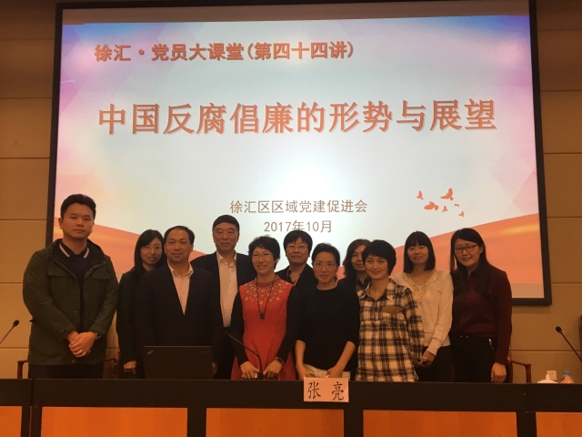 为切实贯彻十九大精神,增强不想腐的自觉,提高廉洁自律意识,10月20日,药学院组织党政班子、总支支委、下属党支部支委,以及学院特邀监察员赴徐汇区委党校聆听题为《不忘初心方得始终——中国反腐倡廉的形势与展望》讲座。讲座由上海市人民检察院高级检察官张亮主讲。张亮老师是国家检察官学院职务犯罪研究所研究员,全国检察机关精品课程第一名,最高人民检察院检察教育培训巡讲团组长,在反腐败的理论和实践方面有深入的研究