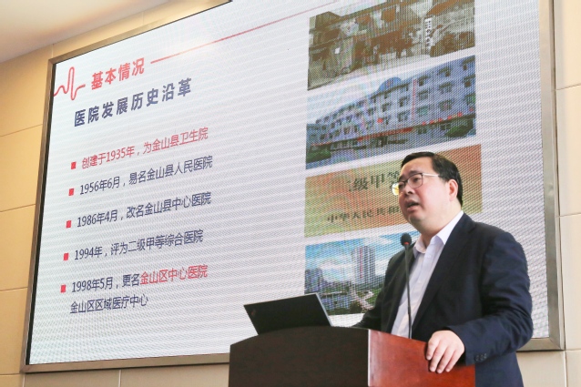 领导致辞结束后,胡军从医院基本情况、创建历程、教学基础及建设成效、展望未来四个方面汇报附属医院创建工作。胡军强调,医院将倾力打造区域医疗卫生高地,建成高水平大学附属医院,为建成三级乙等综合性医院夯实基础,助力金山卫生健康事业快速发展。