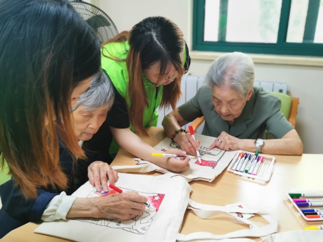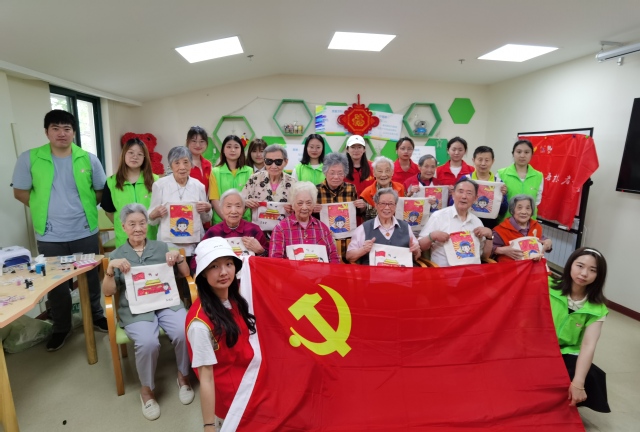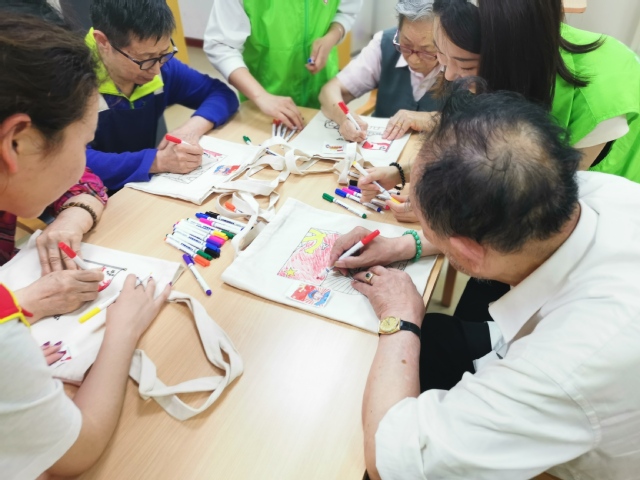 他们依次开展了手指操锻炼、帆布袋制作、挂坠DIY项目。手指操能具有预防老年痴呆症,促进身心健康的作用。学生志愿者们提前掌握一套手指操后,与“长者”们一起体验学习,加强老年人自我调节和保健意识。接着,志愿者们带领“长者”们在帆布袋上围绕党史内容进行涂画。由于有几位“长者”视力或听力有所下降,志愿者一对一耐心地给予协助,帮助他们完善细节部分,并与他们热切交谈。一位百岁老人在为环保袋上的党旗涂色时,嘴里轻声哼唱着《没有共产党就没有新中国》,让志愿者们备受感动与鼓舞。在志愿者细心的指导下,“长者”们将浓烈的党国情感融于颤颤巍巍的一笔一画中。在DIY饰品项目中,志愿者与“长者”们一起制作了滴胶吊坠挂件,并亲手为他们穿戴,送上了医械青年学子们的爱的祝福。欢声笑语回荡在整个房间,“长者”们脸上洋溢着持久的幸福的笑容。