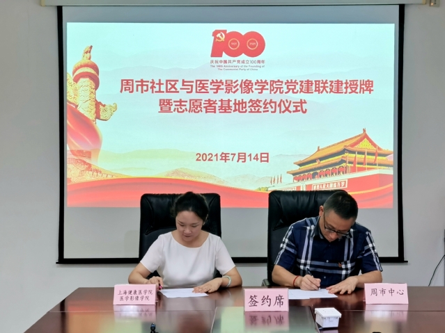 会上,刘红首先感谢周市社区一直以来给予的大力支持,今年恰逢建党100周年,双方开展党建联建具有重要意义。她介绍了党建联建的项目背景及目标,希望双方通过联建,创出特色、创出品牌、收到实效,更好地践行“学党史、办实事”理念,提升“我为群众办实事”的成效,服务社区居民和学院师生。钱国文表示从今年4月起双方已积极开展共建,在周浦镇新冠疫苗接种志愿服务过程中,医学影像学院党总支共计派出3批党员志愿者,有力地支持了本地的疫苗接种工作,取得良好社会效应,期待未来继续保持良好互动。尚淑雅就暑期社会实践活动进行了介绍,并就志愿者实践基地建设,2021年暑期志愿者活动安排进行了说明。随后,刘红和钱国文代表各自单位,进行了志愿者实践基地签约,并共同为党建与思政教育实践基地揭牌。