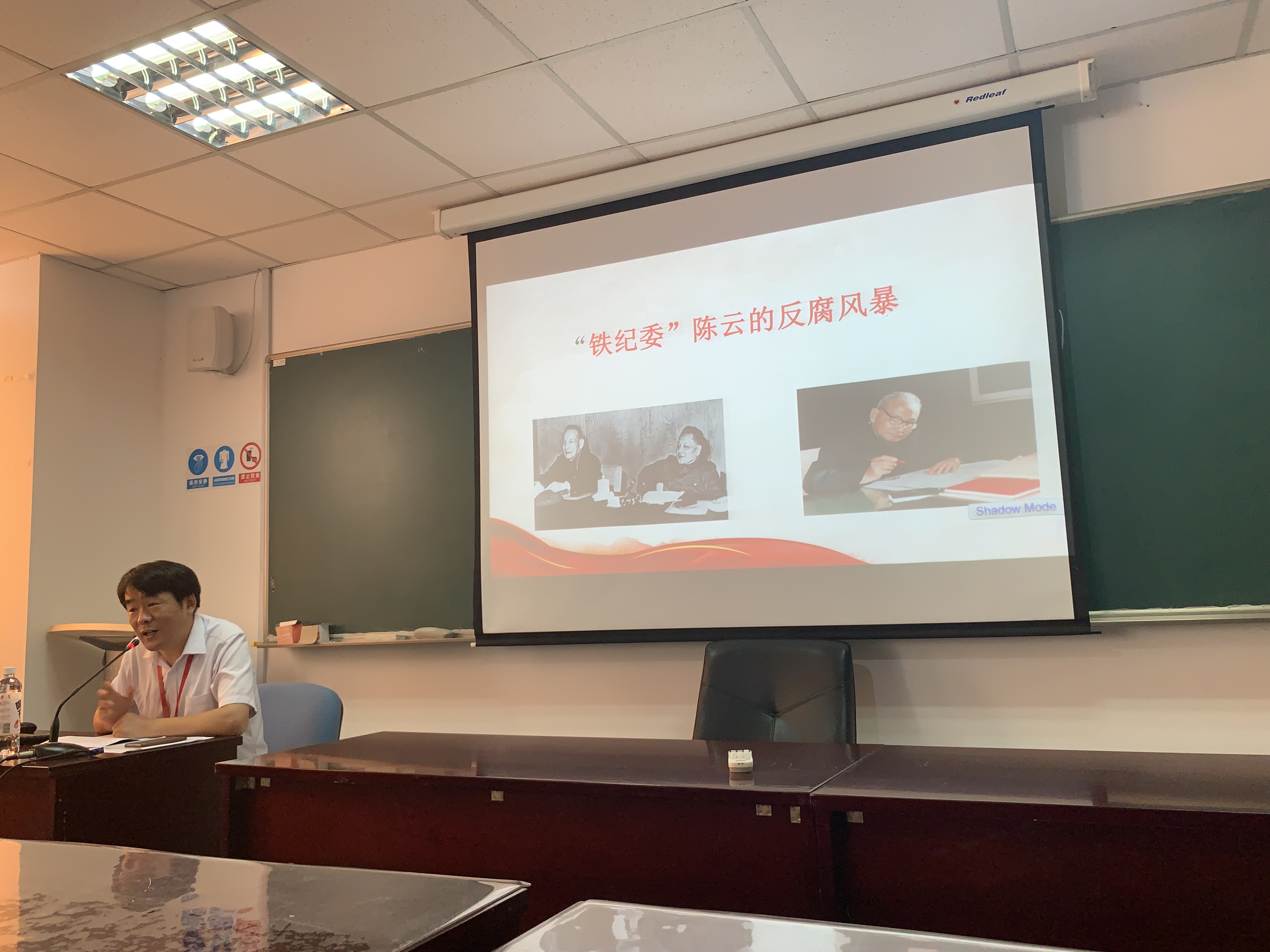 曹月柱从“回顾百年历程,坚定‘四个自信’”、“牢记历史结论,坚定地走自己的路”、“推进理论创新,引领伟大复兴征程”、“加强党的建设,走好新的赶考之路”4个方面,用朴素的语言、大量的史实案例、古今中外的对比,带领老师们重温历史,回望来路,铭记初心,使大家感受到中国共产党的百年光辉历史和伟大成就,对美好未来充满希望和信心。他还以延安“十没有”、“铁纪委”陈云的反腐风暴等材料,重点讲解了中国共产党保持先进性、纯洁性的强大武器就是自我革命,就是要增强全面从严治党永远在路上的政治自觉,为此要做到三个必须:必须坚持党的坚强领导、必须坚持党的全面领导、打铁必须自身硬;坚守三个不变:不变质、不变色、不变味(“一个继承两个消除”);做到三个始终:始终走在时代前列、始终成为全国人民的主心骨、始终成为坚强领导核心。