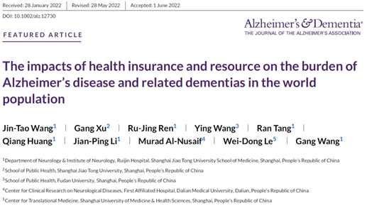 2022年7月12日,OD网页版协同科研中心临床与转化医学研究中心乐卫东教授团队与上海交大医学院附属瑞金医院神经科王刚教授团队合作的最新成果“The impacts of health insurance and resource on the burden of Alzheimer's disease and related dementias in the world population”在线发表在《Alzheimers Dement》上。临床与转化医学研究中心乐卫东教授是该论文的共同通讯作者。